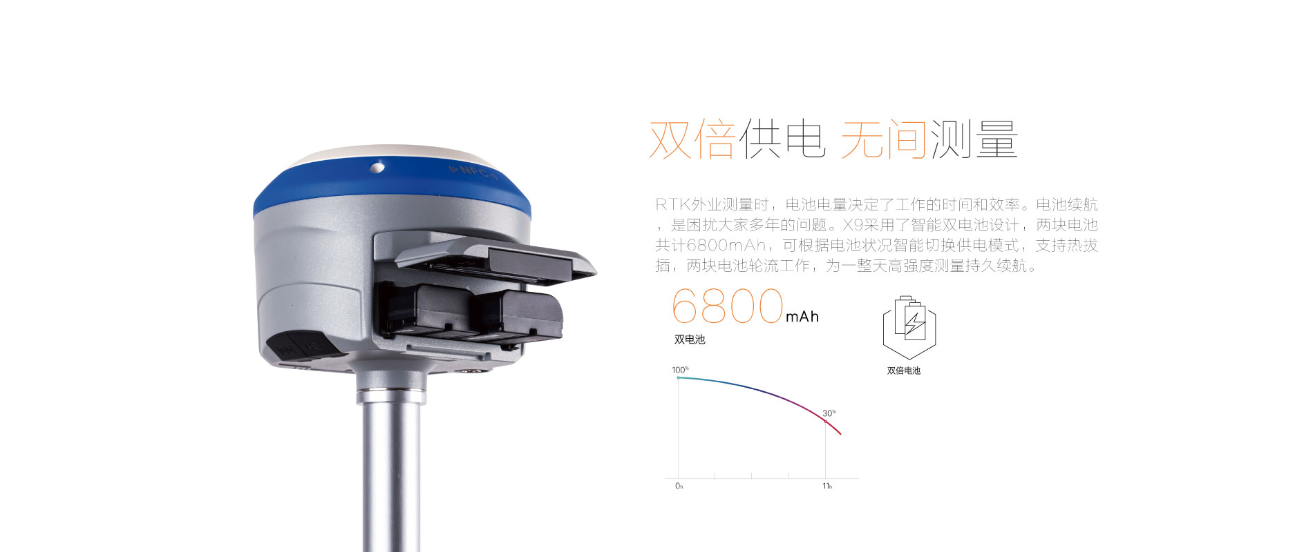 RTK模式12小時(shí),可外接直流電,雙電池電源自動(dòng)切換 |